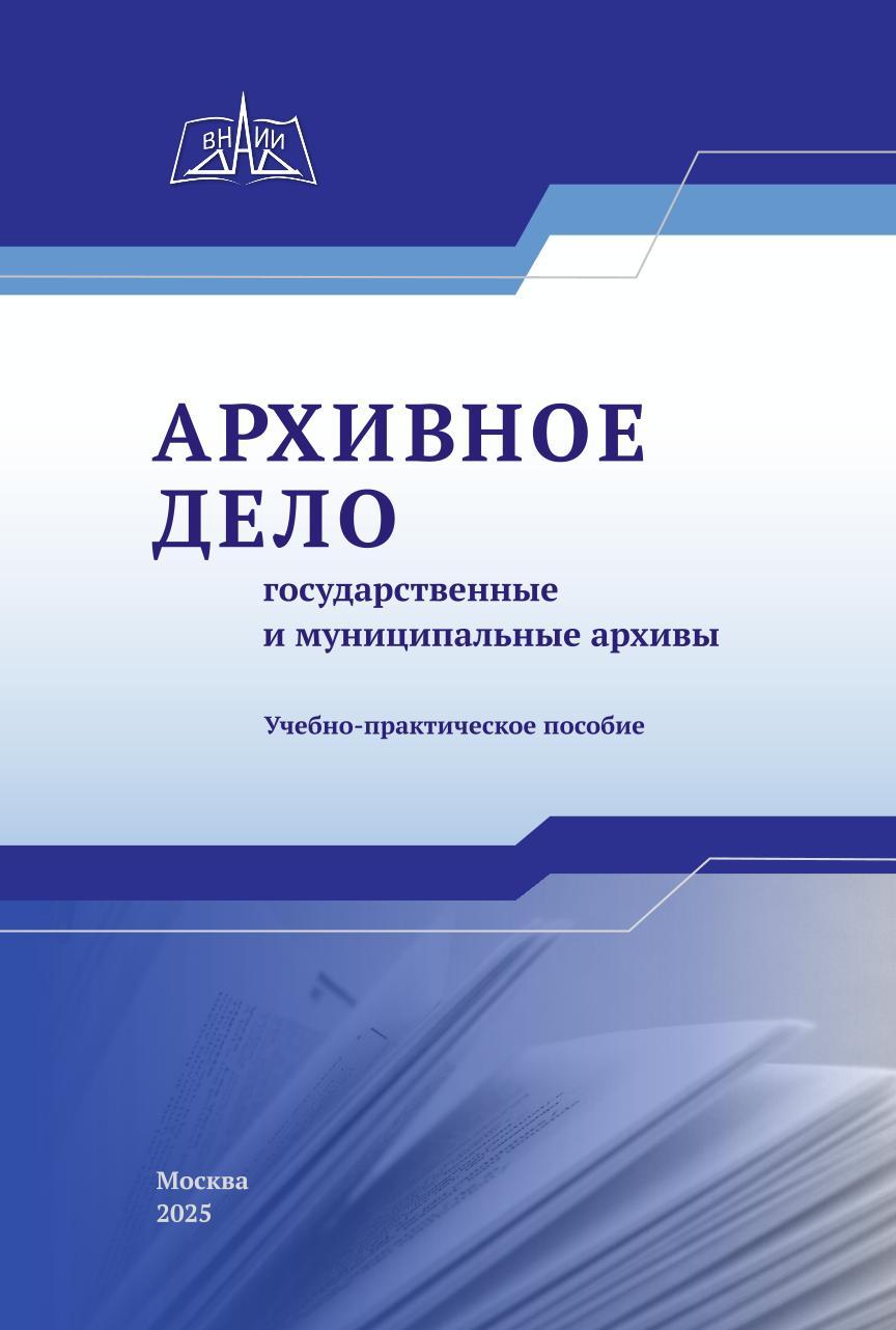 Издано в печатном виде Учебно-практическое пособие «Архивное дело (государственные и муниципальные архивы)»: / отв. сост. Е. А. Романова; сост.: А. Г. Бороздина, Н. А. Герчикова, И. А. Дегтярева, В. А. Еремченко, М. И. Мельтюхов, М. Л. Нагорная, И. В. Сабенникова, Н. А. Ткаченко. – М.: ВНИИДАД, 2025. – 380 с.